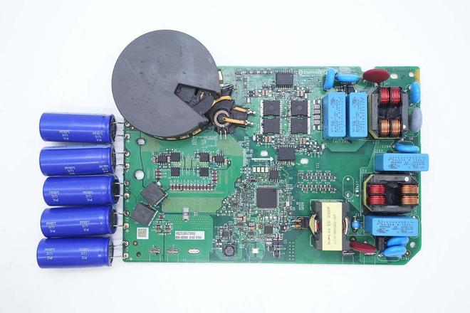 PCBA模块正面一览,左侧直流输入端设有滤波电容,滤波电感,升压开关管,驱动器和变压器。中间位置设有主控芯片,隔离驱动器,调制开关管,右侧设有输出滤波电路和电力线通信电路。