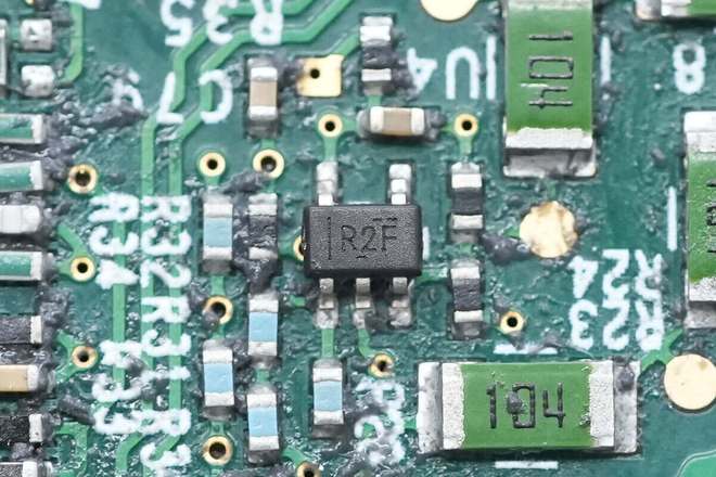 电压比较器来自德州仪器,丝印R2F,型号LMV331,为通用低电压比较器,采用SC70封装。