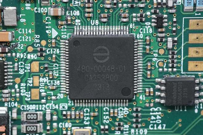 逆变器主控芯片来自ENPHASE,丝印480-00048-01,逆变器直流升压和输出调制都是由这颗主控芯片输出控制信号,其中直流升压为半桥驱动器驱动,交流调制通过隔离驱动器进行驱动,采用LQFP80封装。