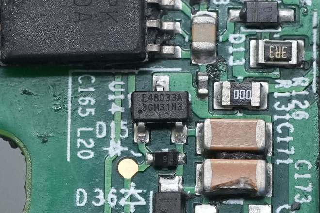 隔离驱动器外置的稳压芯片来自ENPHASE,丝印E48033A,采用SOT23封装。