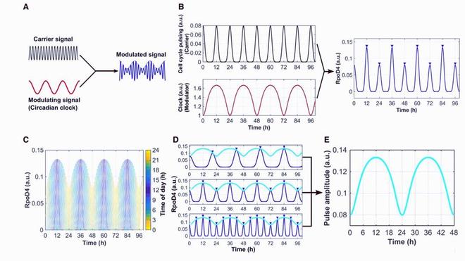 蓝细菌体内有一种被称为“RPO D4”的蛋白质,每当细胞准备分裂时,这种蛋白质就会发出一种类似脉冲的跳动信号,而这种信号还受到了细菌内部24小时生物钟的精密控制。其中细胞分裂的节奏就像是一个“载波信号”,而生物钟发出的指令则是“调制信号”。